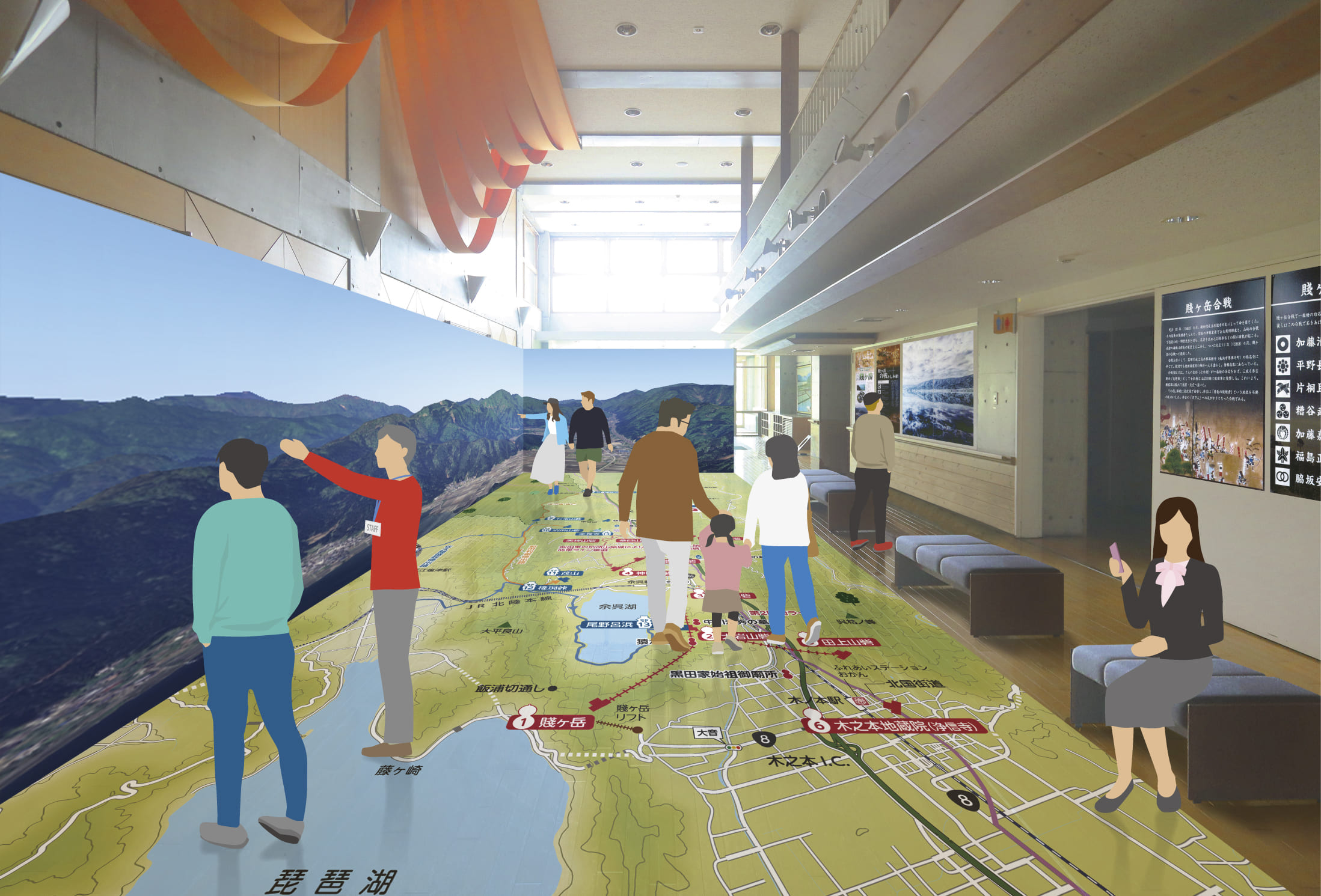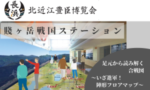 賤ケ岳合戦エリアは、実際の戦場跡の地形に学びを得た参加型展示を通じて、戦国時代の戦術や人間模様に触れる場です。入口の大判陣形フロアマップを歩きながら陣形を読み解き、武将抽選ゲームで役割を引いて仲間と作戦を立てる—そんな体験型の動線で展示を巡ります。実寸パネルや「戦国リアルサイズ・ギャラリー」、精巧なジオラマとフォトビュー・シアターが合戦の全貌を立体的に伝え、子どもから歴史ファンまで世代を問わず楽しめる構成を目指しています。